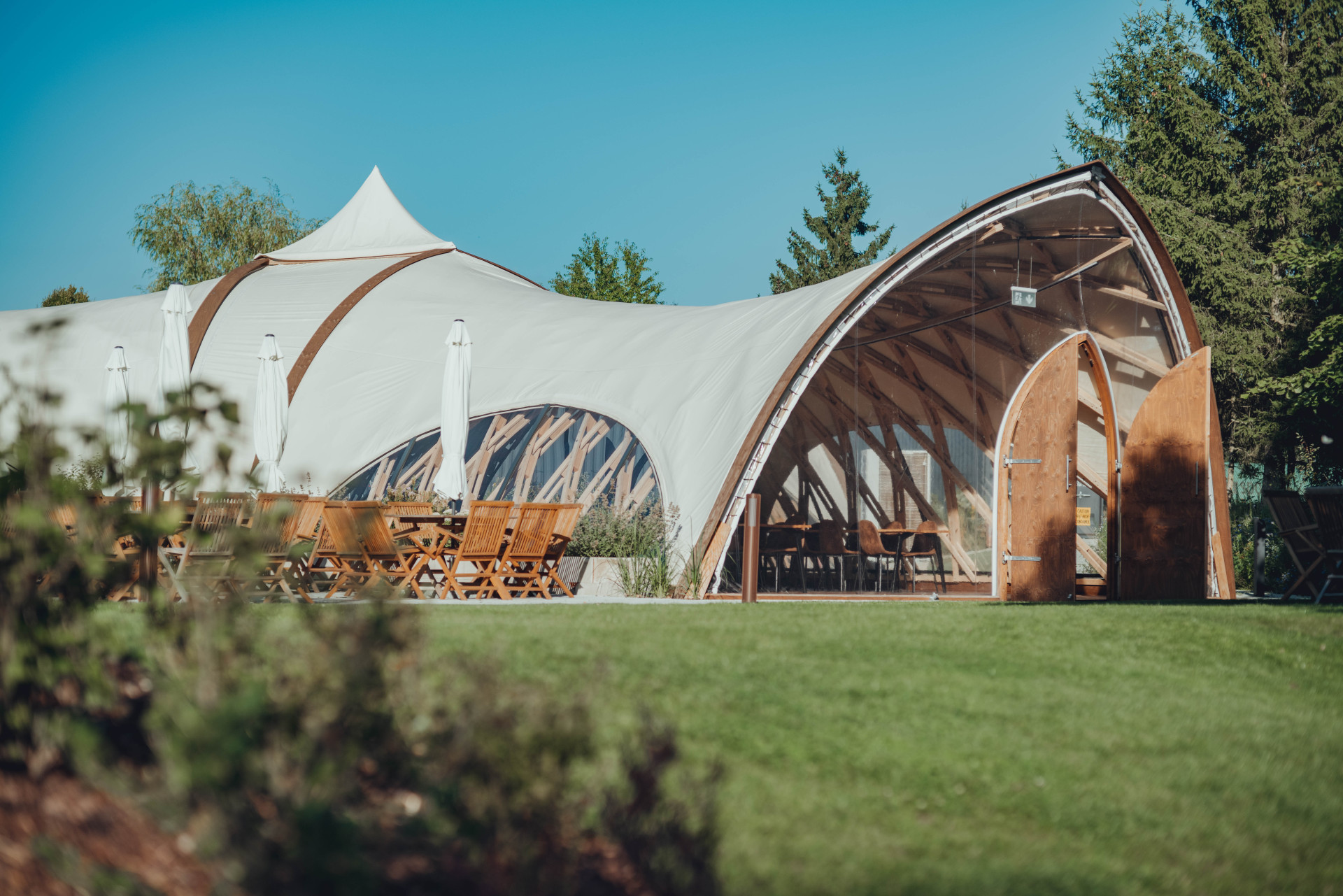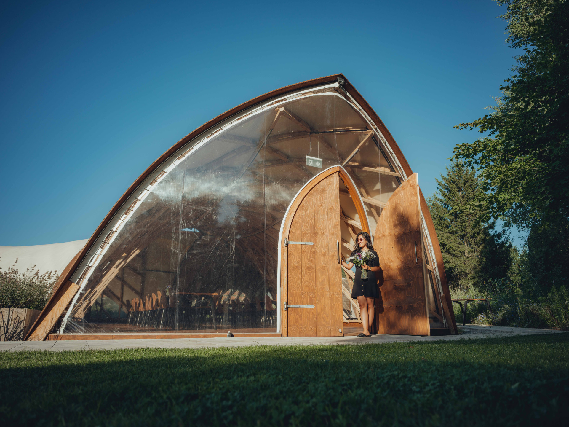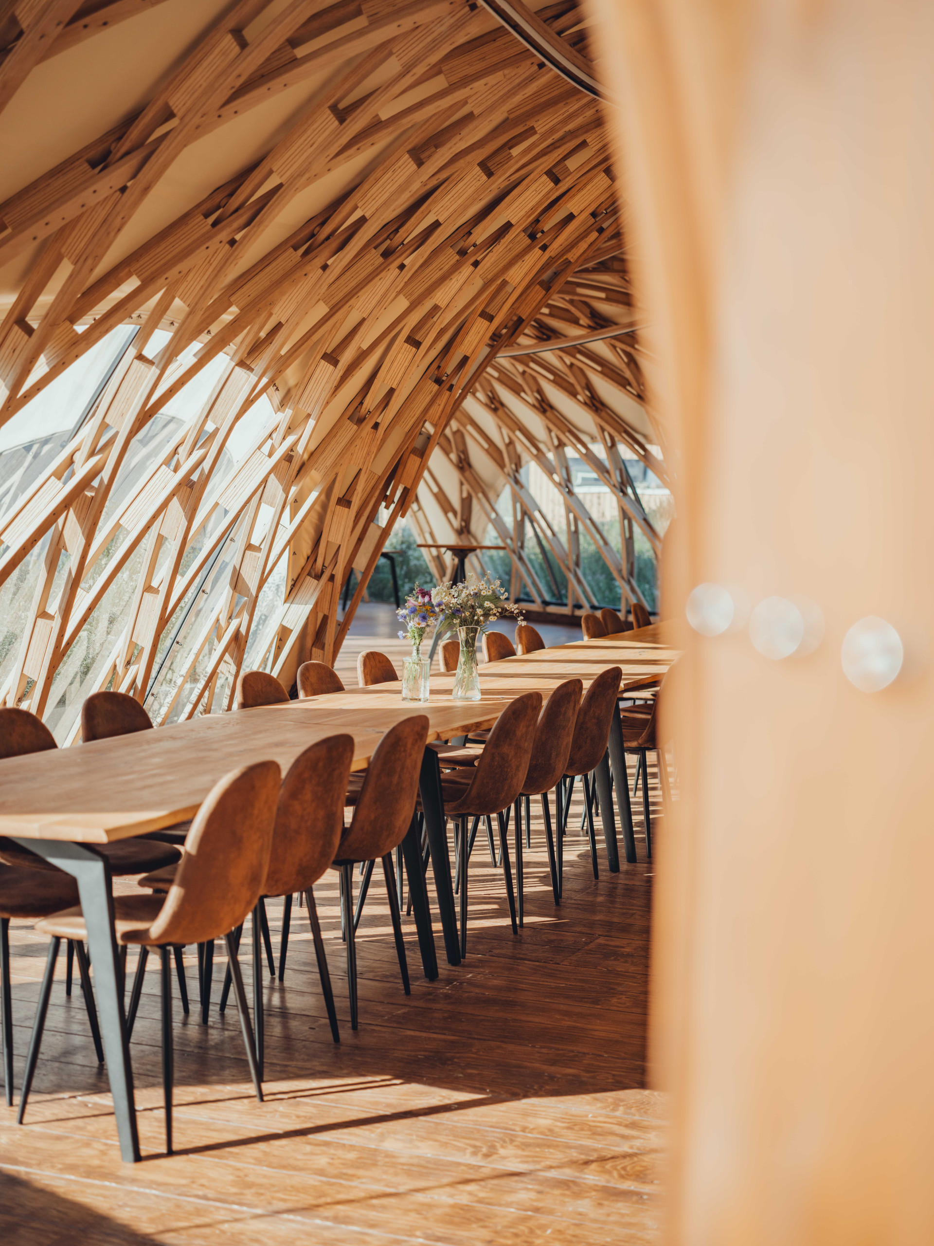 With its striking double timber gridshell and an impressive 330 m² of covered outdoor space, it is the largest and most robust pavilion we have built to date — and the new centerpiece for weddings, concerts, and cultural events that take place all year round.