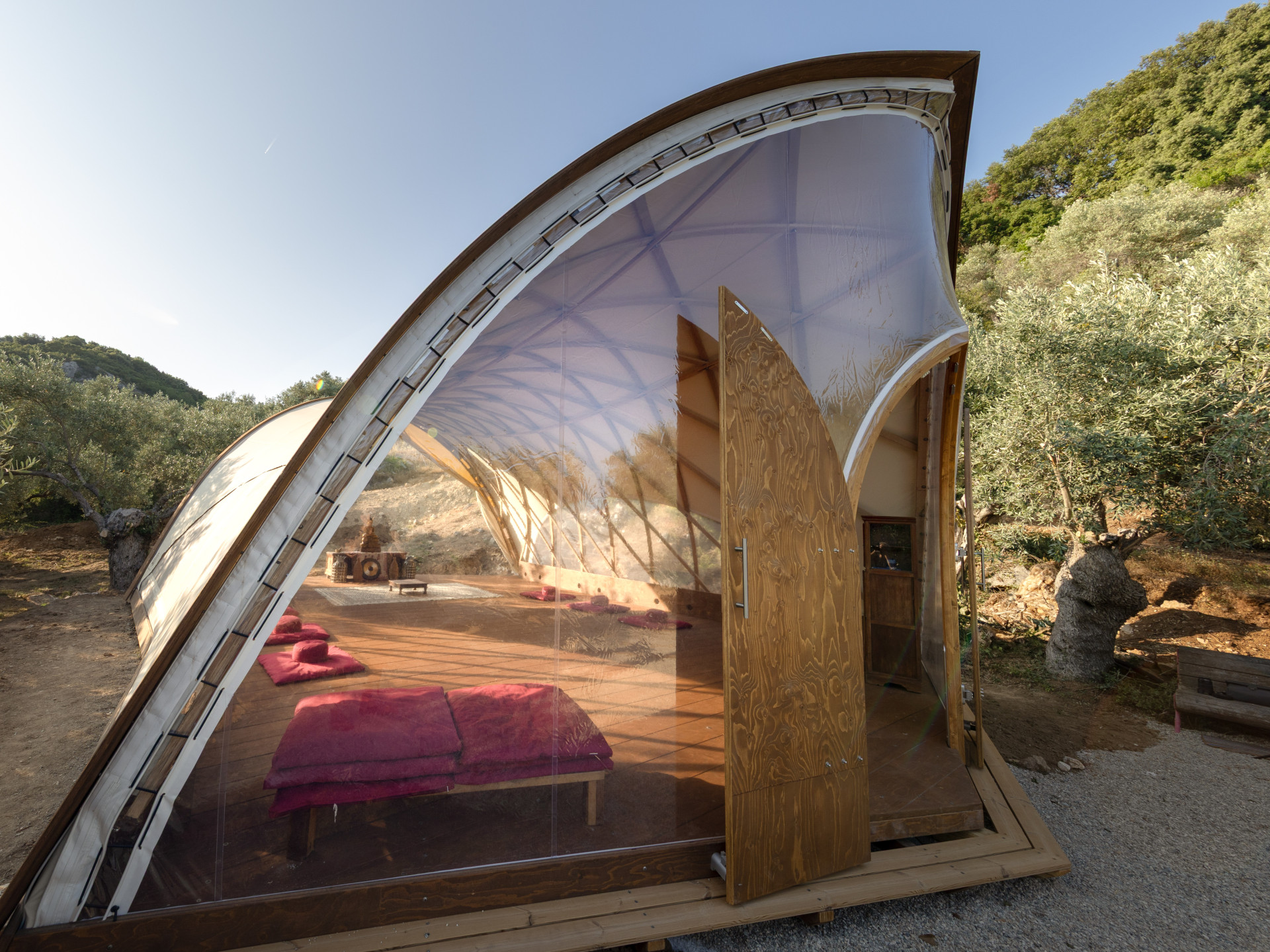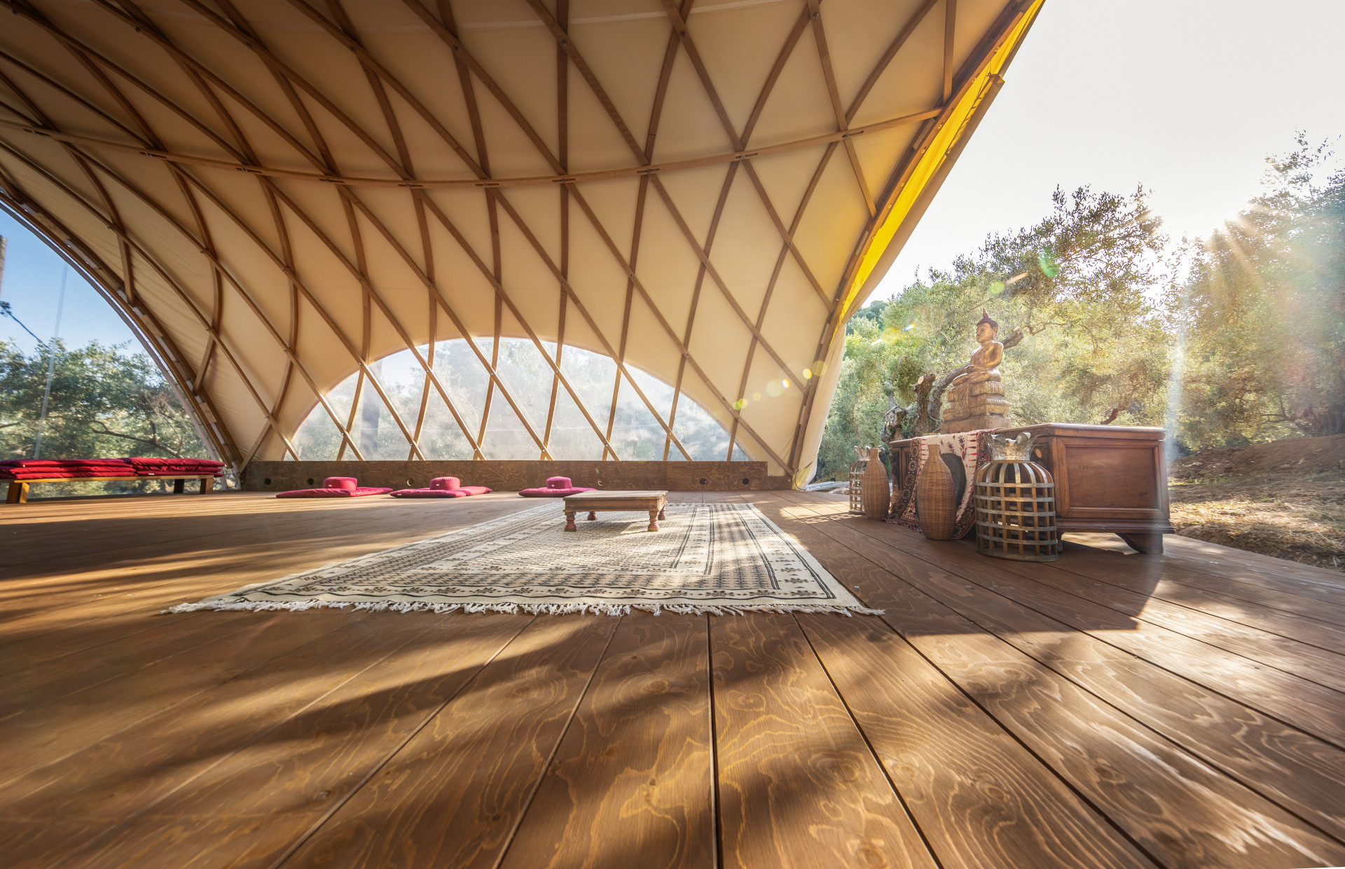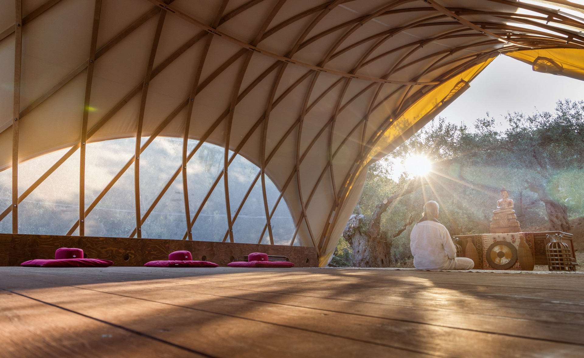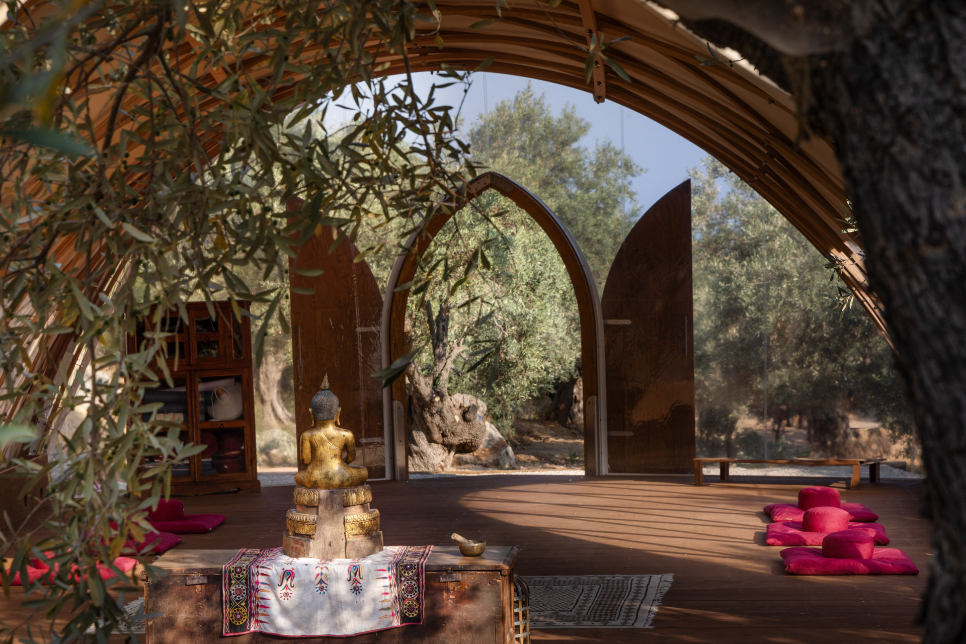 Nestled in the hills of southern Pelion, Greece, surrounded by centuries-old olive trees, Peter and Elisabeth Riedl have created a place that unites nature, tranquility, and togetherness with our pavilion. They lovingly call it their “Buddha Hall” – an open, light-filled space for yoga, meditation, and seminars. The result is a retreat that blends harmoniously into the Greek landscape while meeting the highest ecological standards.